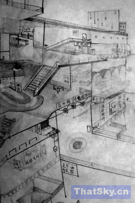 当时看了《科幻世界》里一副电脑3D作品,很喜欢那种3D透视的结构,这幅画的基本结构是临摹那副图的,不过建筑物上的广告标语,招牌等都换了,都换成了高中同学的绰号或者名字的谐音。